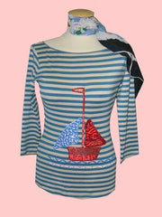 tee-shirt in 95% viscose 5% elasthane printed stripes sailor and embroidered of a boat size : S/M/L colors : blue/beige