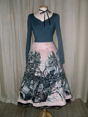 skirt in velvet 100% cotton, printed with a country picture and embroidered of sequins. care wash : dry clean size : S/M/L colors : pink/grey -